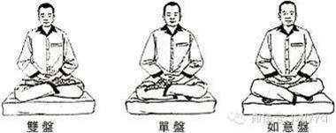 坐的姿式要端正自然。下額內斂,廷胸收腹,肩與胯上下垂直一線。雙腿最好結跏趺坐,如果不能雙盤,更不要免強,避免腿痛不利於久坐。但散盤容易使身體後仰,失去重心,所以散盤時要用一個薄一點的枕頭墊在臀下,有利於身體平衡。特別是冬天,打坐時一定要把膝關節用毛毯之類的包住,因為雙膝向內彎曲時,膝蓋骨外則下邊的穴道(用手摸凹陷部位)是開放的,容易進入涼氣引起風濕。另外,特別要提醒的是,用雙盤打坐的,坐禪結束後要雙腿前伸,兩手按摩腳心,促進腳底血液遁環。站起後兩腿輪換側僕壓壓腿或下下腰。因為雙盤容易導致腿部肌肉萎縮,腿骨變形成O型腿,走路飄浮無力,所以如果常期堅持坐打坐的人,按摩和側壓腿非常必要。