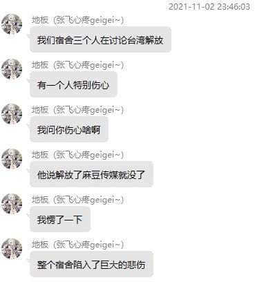 日前一段中國大學生閒聊的聊天內容被截圖上傳至網路,其中就討論到「我們宿舍三個人在討論台灣解放,其中有一個人特別傷心」,原來竟是擔心解放以後麻豆傳媒恐怕就沒了,頓時「整個宿舍陷入了巨大的悲傷」。